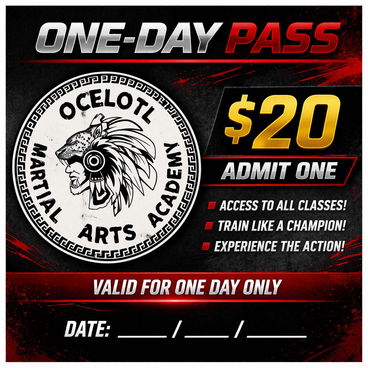Train with us for a full day at Ocelotl. This one day pass gives you access to all classes so you can experience everything we offer in one place. Whether you are new or experienced, come try Brazilian Jiu Jitsu, Judo, MMA, and Kickboxing.